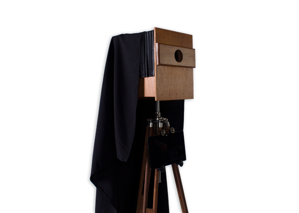 Our Vintage Photo Booth set-up includes a stylish wooden camera box, wooden tripod, and black backdrop.